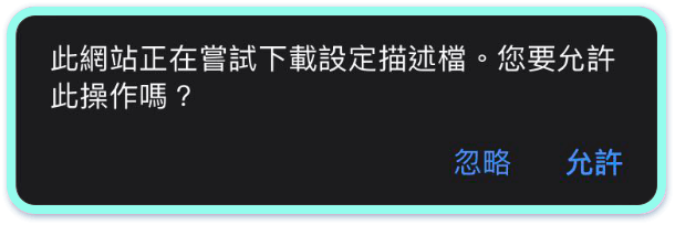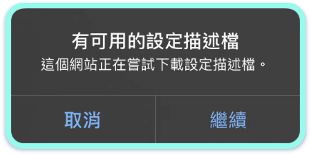 點擊「開始安裝」即跳出下載描述檔視窗,請點擊「繼續」,並點擊「允許」下載描述檔案。