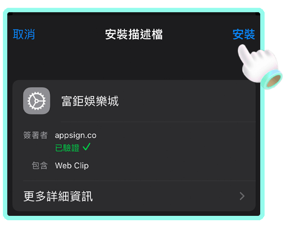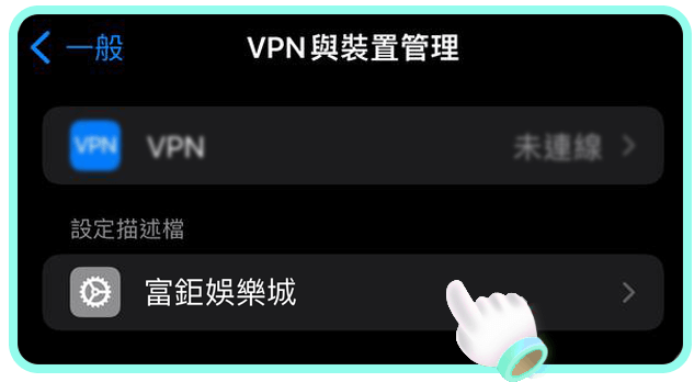 請至手機「設定」中檢視已下載描述檔,點擊「一般」進入後選擇「VPN與裝置管理」,再點選「富鉅娛樂城」最後點擊「安裝」描述檔。